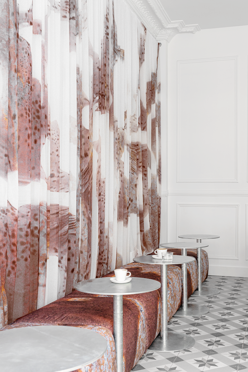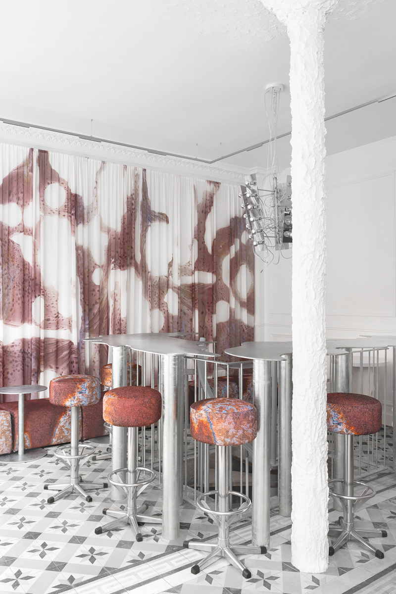 The interior strikes a balance between technical clarity and a tactile experience. Cool metal surfaces contrast with the textures of the seating, whose surfaces recall oxidized metal, introducing an organic, almost accidental dimension into the space. Semi-transparent textiles with abstract patterns soften the spatial perception, adding depth and movement.